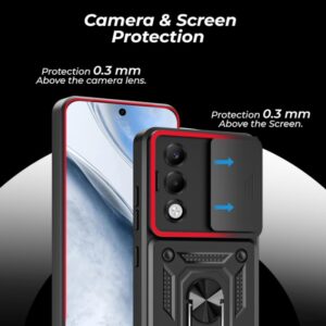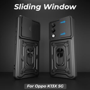 Protect your Oppo K13x 5G with this Armor Bumper Back Case, designed for maximum durability and style. Made with shockproof TPU material, it shields your phone from accidental drops and impacts. The case features a sliding camera cover for lens protection and a built-in ring holder stand that doubles as a secure grip and kickstand for hands-free use. With its rugged bumper design and sleek black finish, this case delivers both tough protection and modern style.