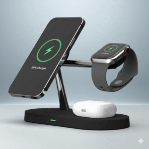 The 5-in-1 Magnetic Wireless Charger is engineered to charge your iPhone, Apple Watch, and AirPods simultaneously, making it an ideal solution for Apple enthusiasts. With a strong magnetic hold, your devices stay perfectly aligned for fast, efficient, and uninterrupted charging. The powerful magnets ensure that your devices remain stable on the charger, preventing accidental slips or falls, while the anti-slip silicone base keeps the entire setup firmly in place on any flat surface.