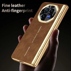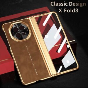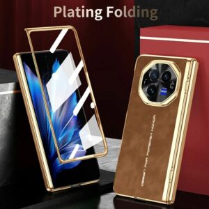 Vivo X Fold3 Pro Phone Case with Tempered Glass Film Electroplating Leather+PC Mobile Cover – Brown