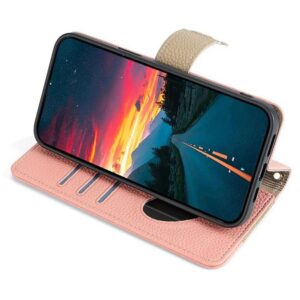 The light pink color adds a feminine touch that blends effortlessly with any outfit, making it an ideal choice for fashion-forward users. The case offers not just beauty, but also practicality with wallet, purse, and phone cover combined into one stunning design.